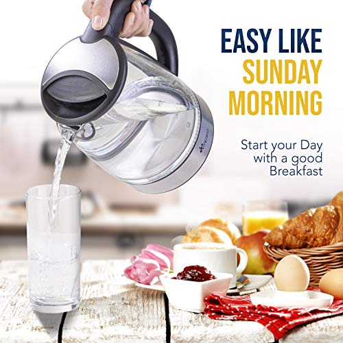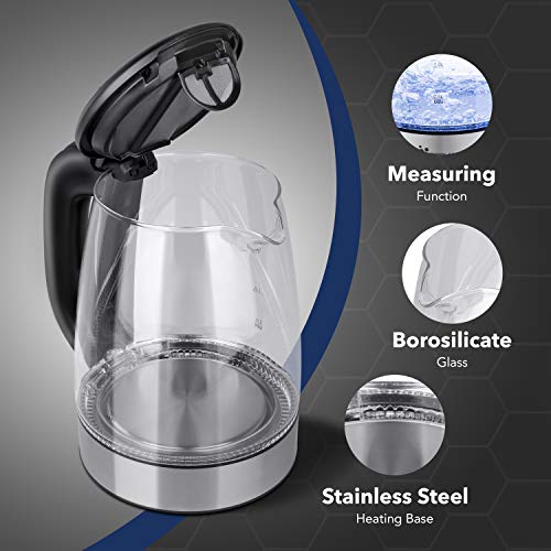 TRESKO Glas Wasserkocher 1.7L – 2200W | LED-Beleuchtung | BPA -frei | 360° Edelstahl Sockel | Abschaltautomatik | Filter