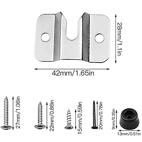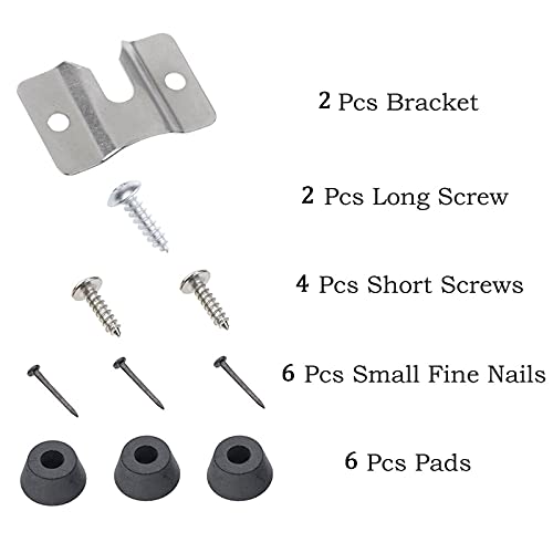 Hoeveelheid: 2 sets dartbordenhaken, inclusief 2 metalen beugels, 2 lange schroeven, 4 korte schroeven, 6 kunststof pads en 6 kleine zwarte nagels.