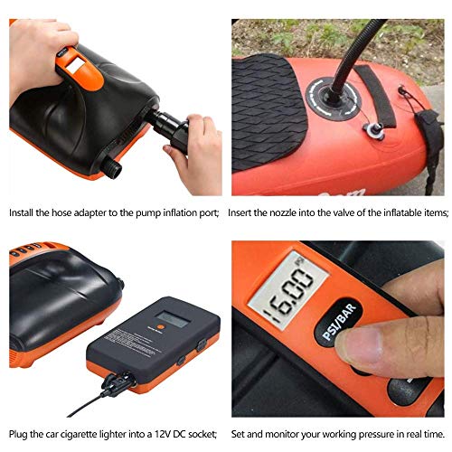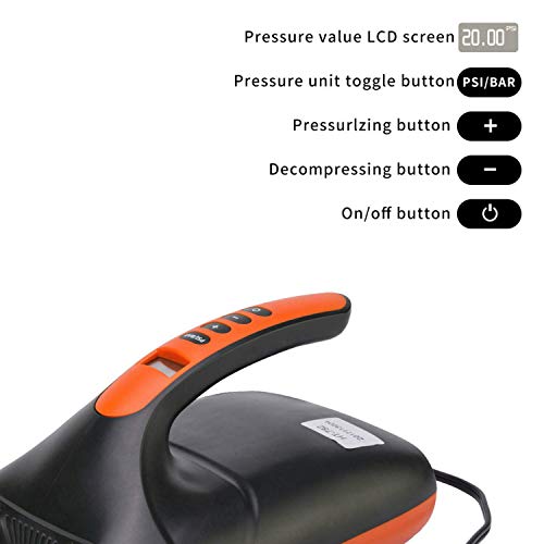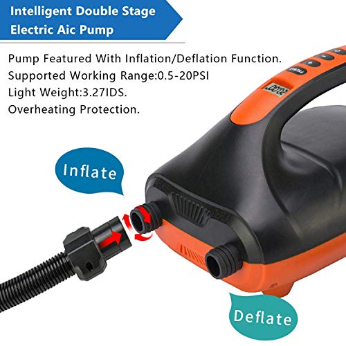 Specification: Tuomico 20PSI SUP-Pumpe 12 V DC Intelligente zweistufige Auto-Off-Funktion Hochdruck-Stand-Up-Boardpumpe mit Feuerzeugen und Schlauch für SUP-Paddel und Schlauchboot